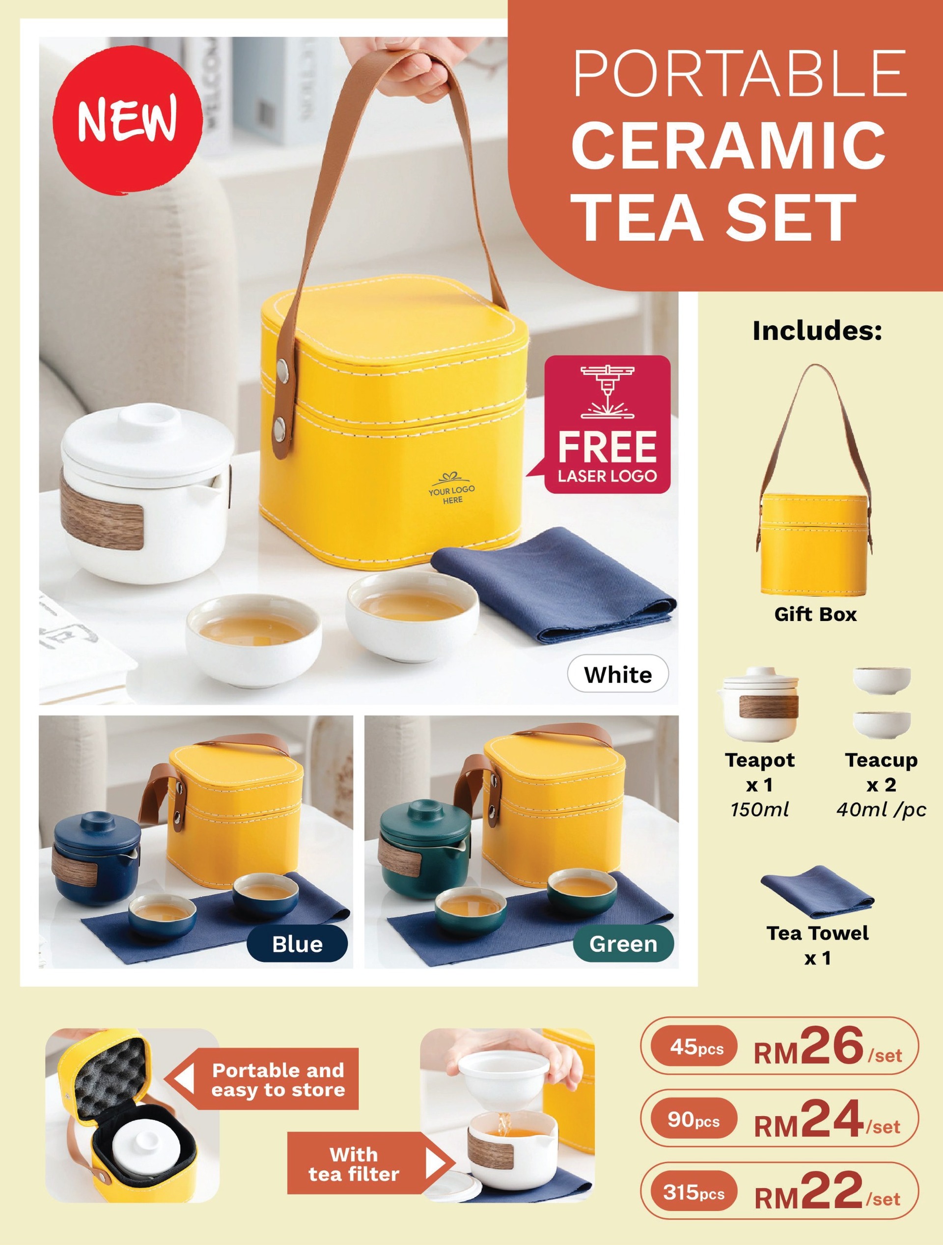 Our elegant ceramic tea set, features a tea filter and two stylish teacups. Enjoy its portability and convenient storage, all in a lovely gift box.